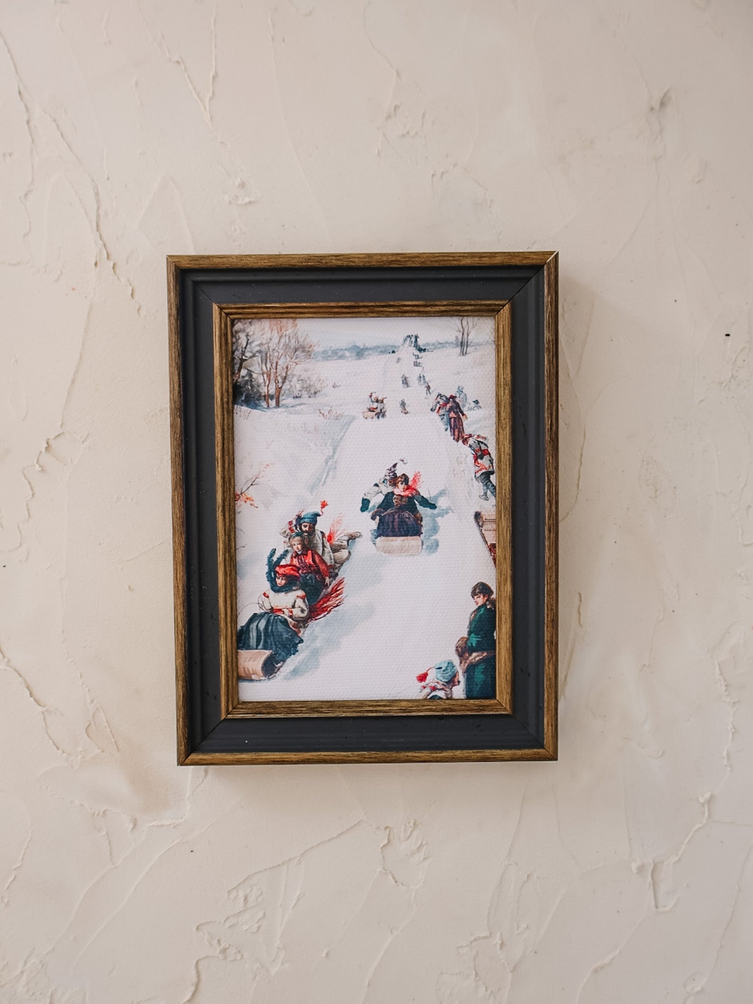 This vintage-inspired tobagganing scene is printed on raw canvas and placed in an antiqued, greyed frame for an authentic, timeless look. Looks stunning in a small wall space, on a shelf or ledge, or as a part of a gallery wall.