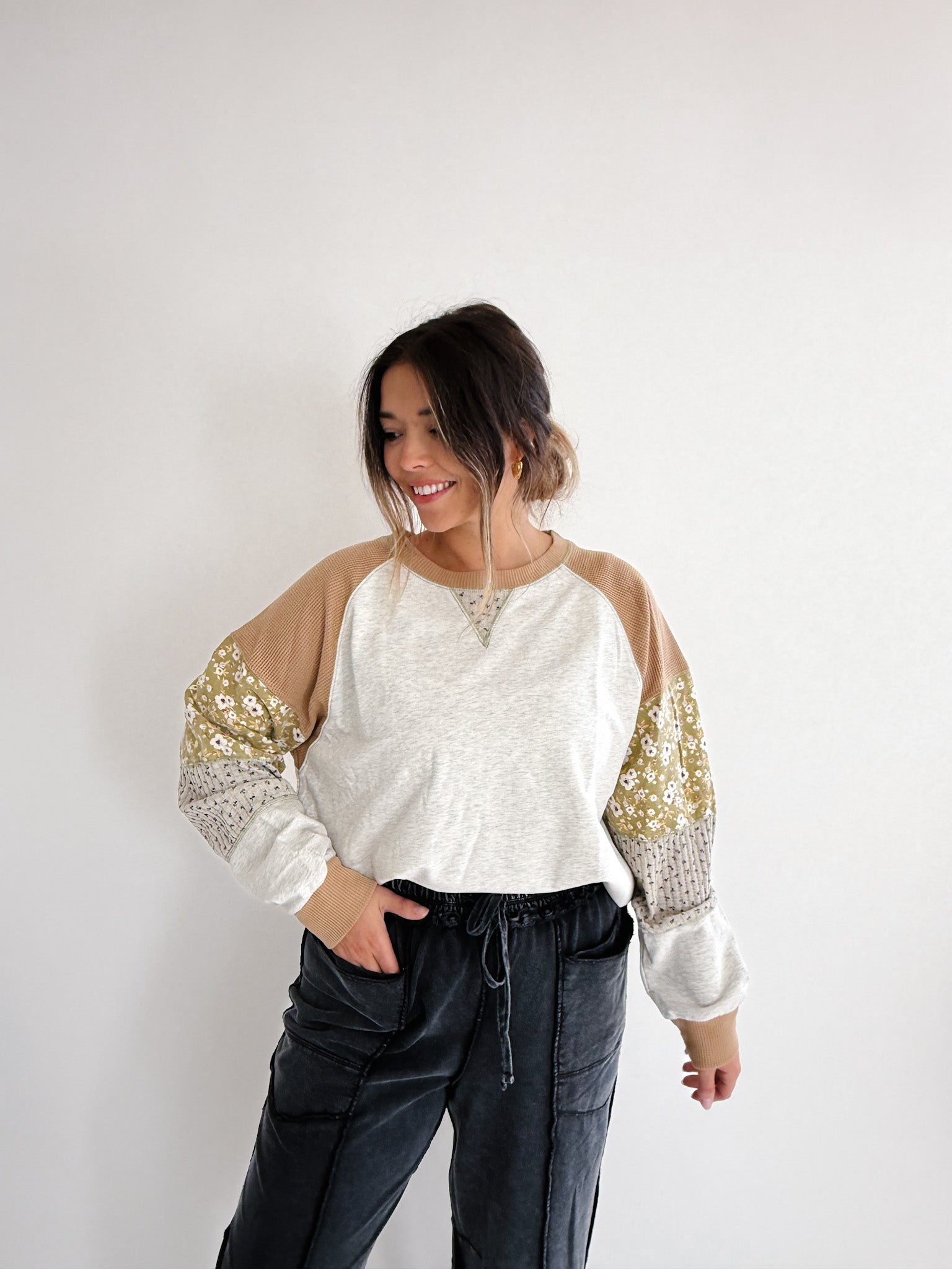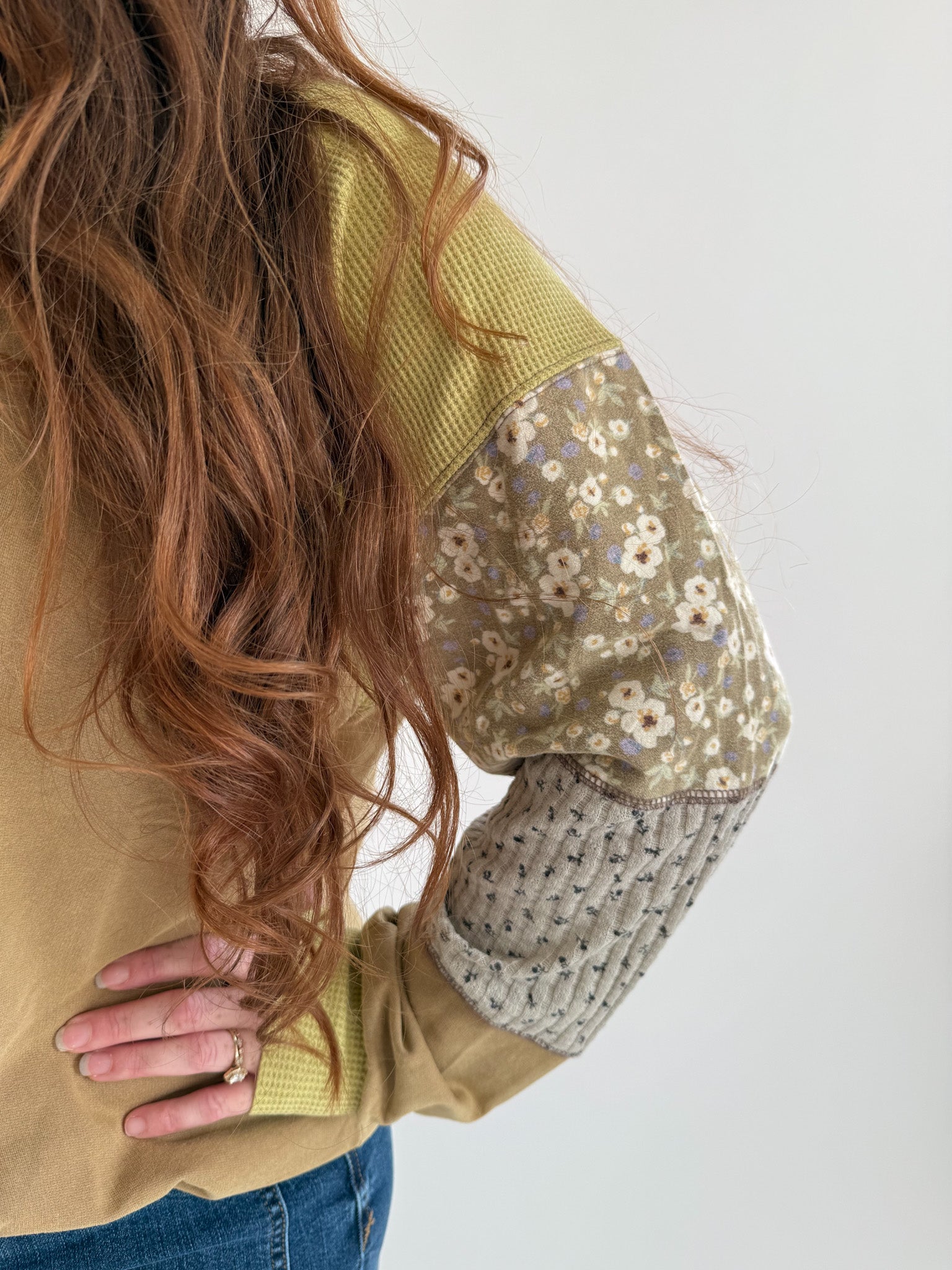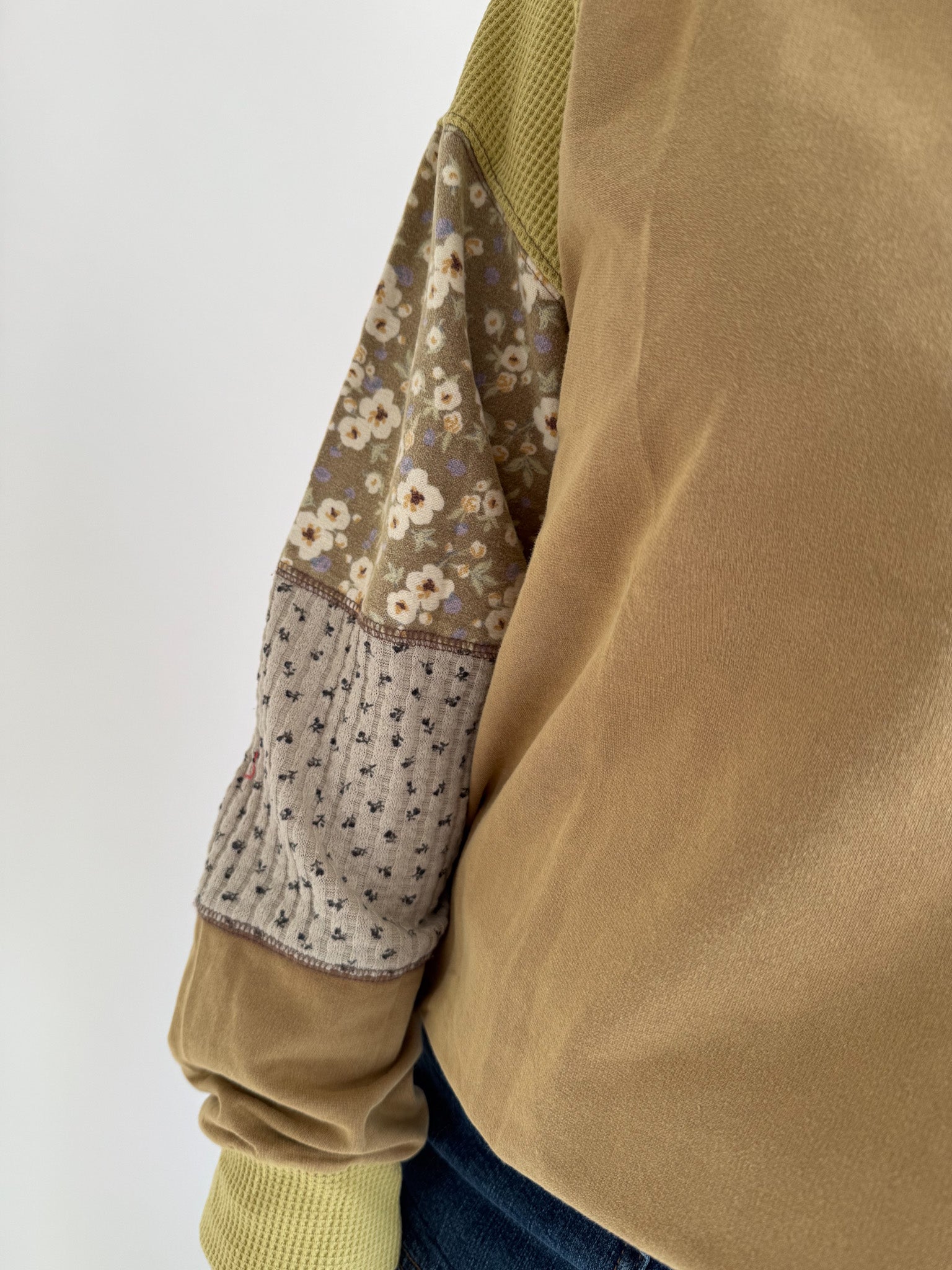 A soft, slouchy pullover with soul, designed in a dreamy heathered gray or earthy mocha. Its patchwork sleeves tell a story of comfort and craft—think vintage florals, subtle waffle textures, and delicate ditsy prints, stitched together in harmony.