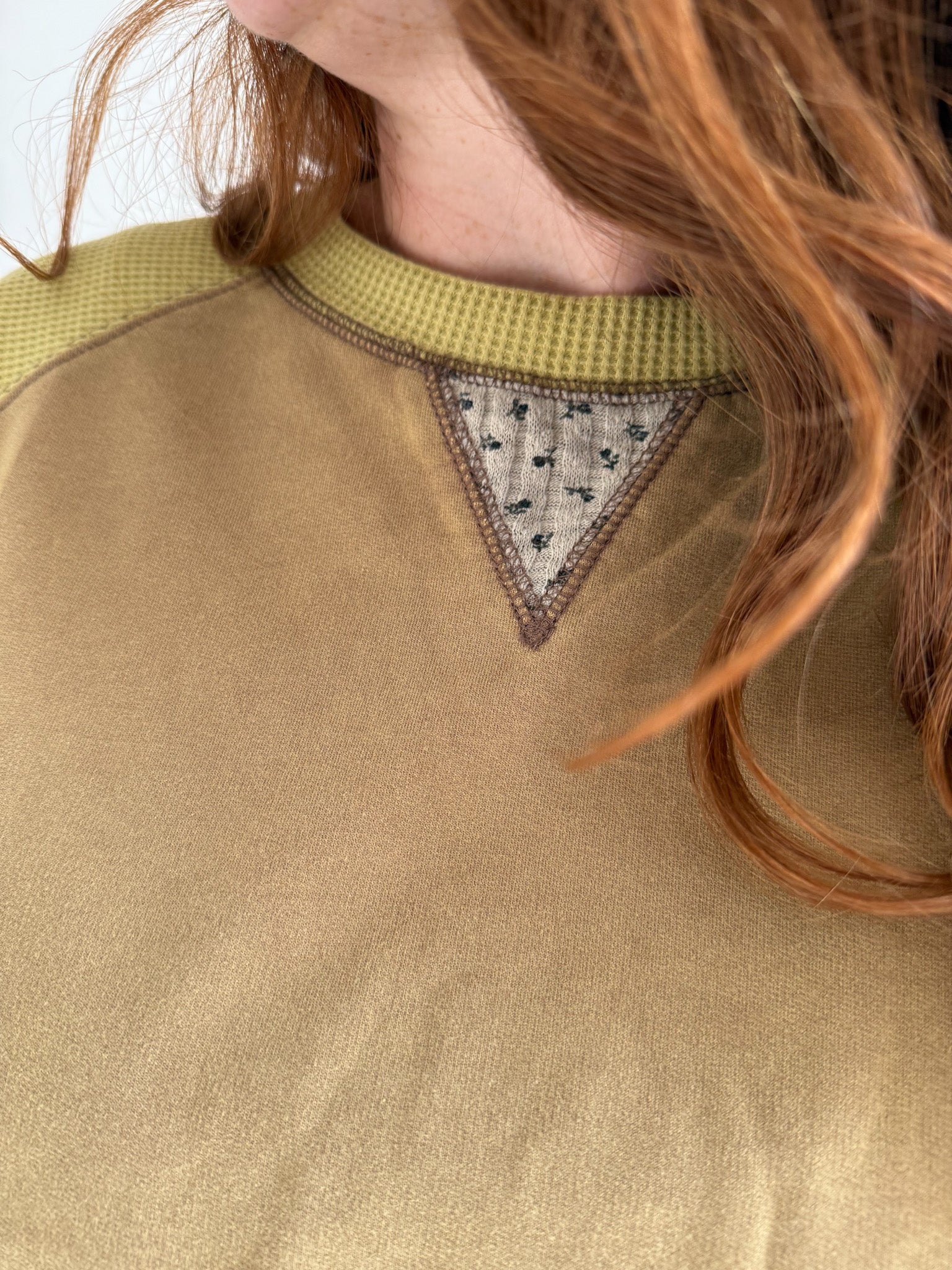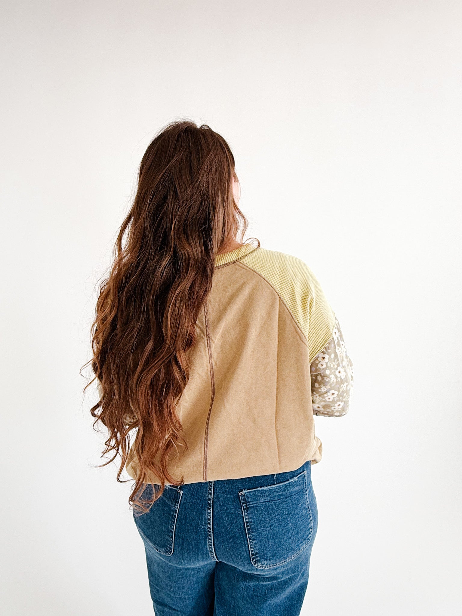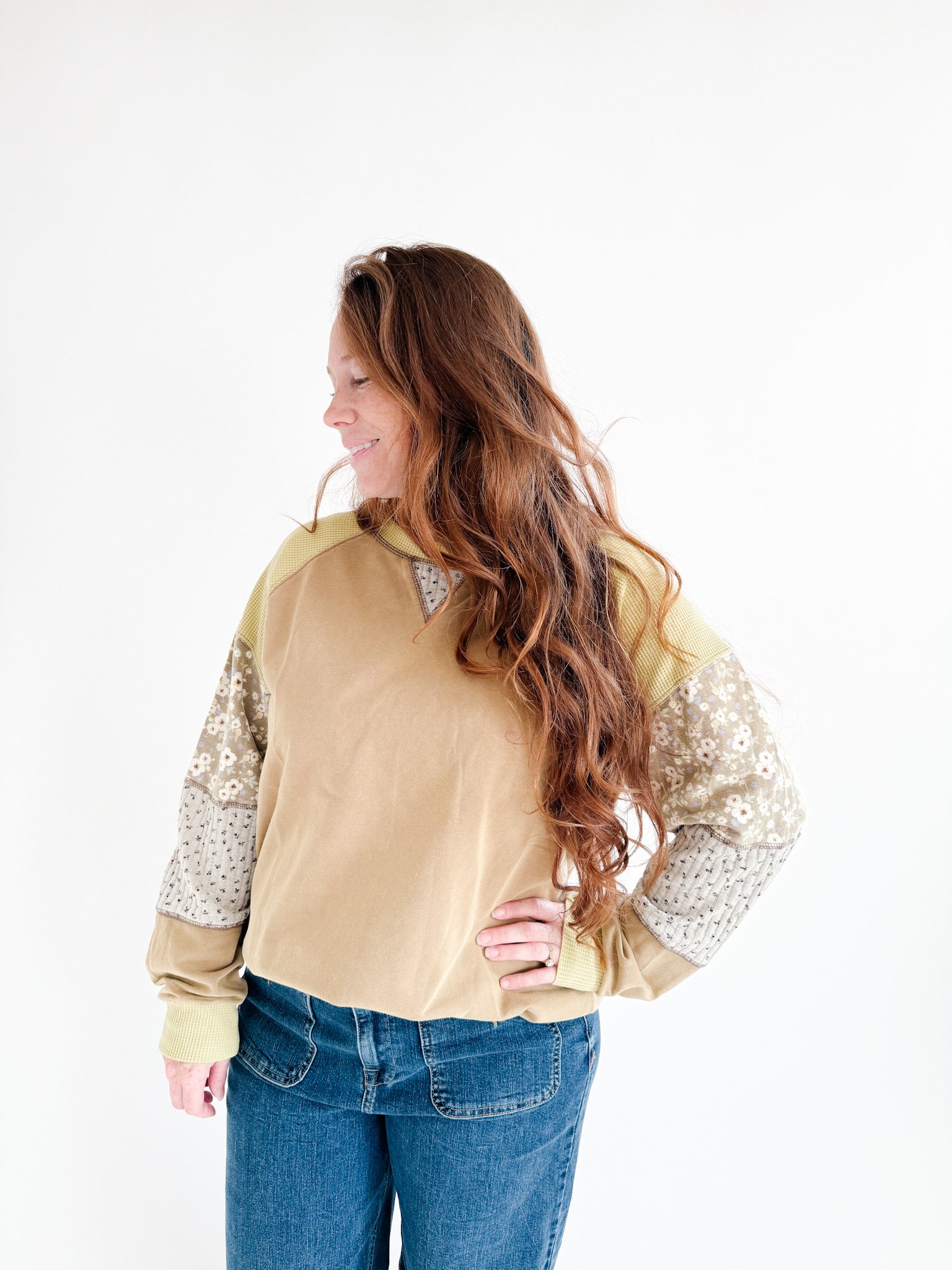A soft, slouchy pullover with soul, designed in a dreamy heathered gray or earthy mocha. Its patchwork sleeves tell a story of comfort and craft—think vintage florals, subtle waffle textures, and delicate ditsy prints, stitched together in harmony.