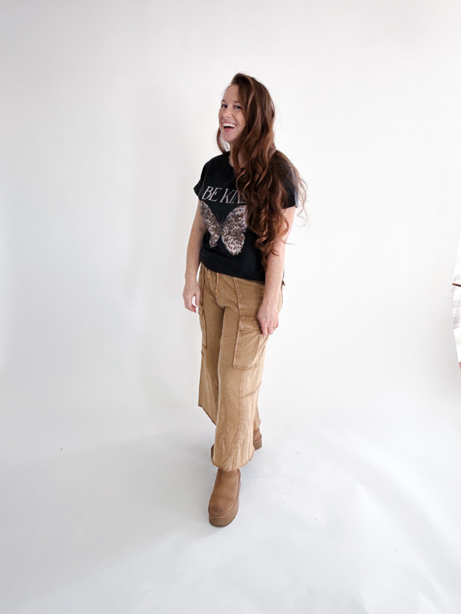 This mineral-washed tee features a vintage butterfly graphic paired with the message: BE KIND. It has a comfortable round neckline, short sleeves, a dropped shoulder design, and a relaxed fit for easy, everyday wear.