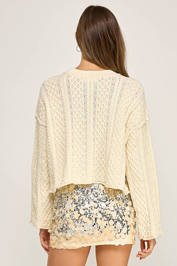 Bring warm, cozy vibes to your closet with this cute cropped pullover. It showcases detailed cable knit designs and a laid-back silhouette. Ideal for a comfy yet trendy outfit, it pairs effortlessly with high-waisted pants or skirts.