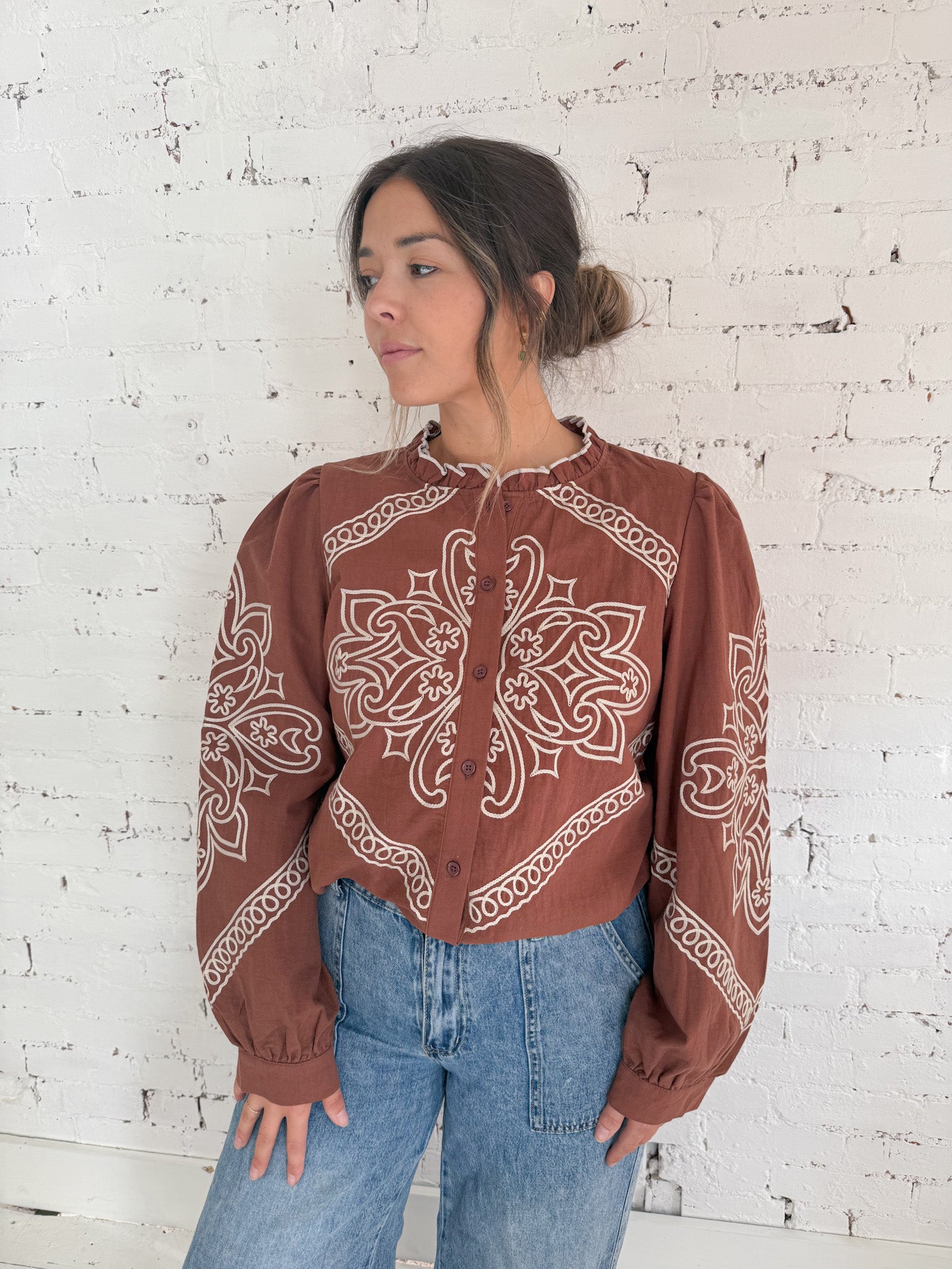Embrace your free-spirited side, where boho charm meets a touch of Western wanderlust. Lightweight woven fabric with delicate embroidery across the front and sleeves, while a ruffled mock neck and button-down placket keep things effortlessly feminine. Long puff sleeves with buttoned cuffs add a playful, breezy finish. Pair it with your favorite jeans, flowing skirts, or worn-in boots for a look that’s as relaxed as it is flattering.
