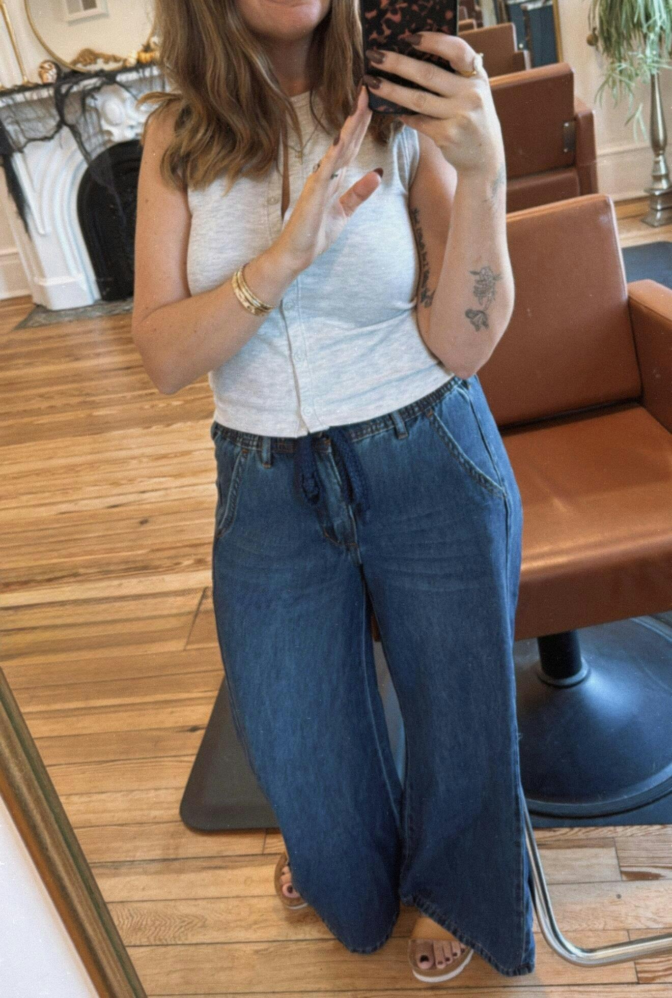 A breezy take on a classic, these wide-leg denim pants bring movement and ease to your everyday looks. These pants are buttery soft! The elasticized waist with drawstring keeps them comfortable while the flowy silhouette feels both relaxed and polished. Pair them with a tucked-in top for an elevated mood, a fitted tee for weekend simplicity, or lean into the denim-on-denim moment with the matching button-down top. They’re equally perfect with strappy sandals in warm weather or ankle boots layered under the hem come fall.