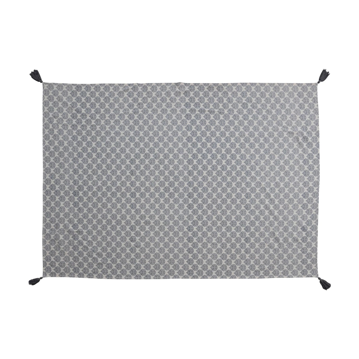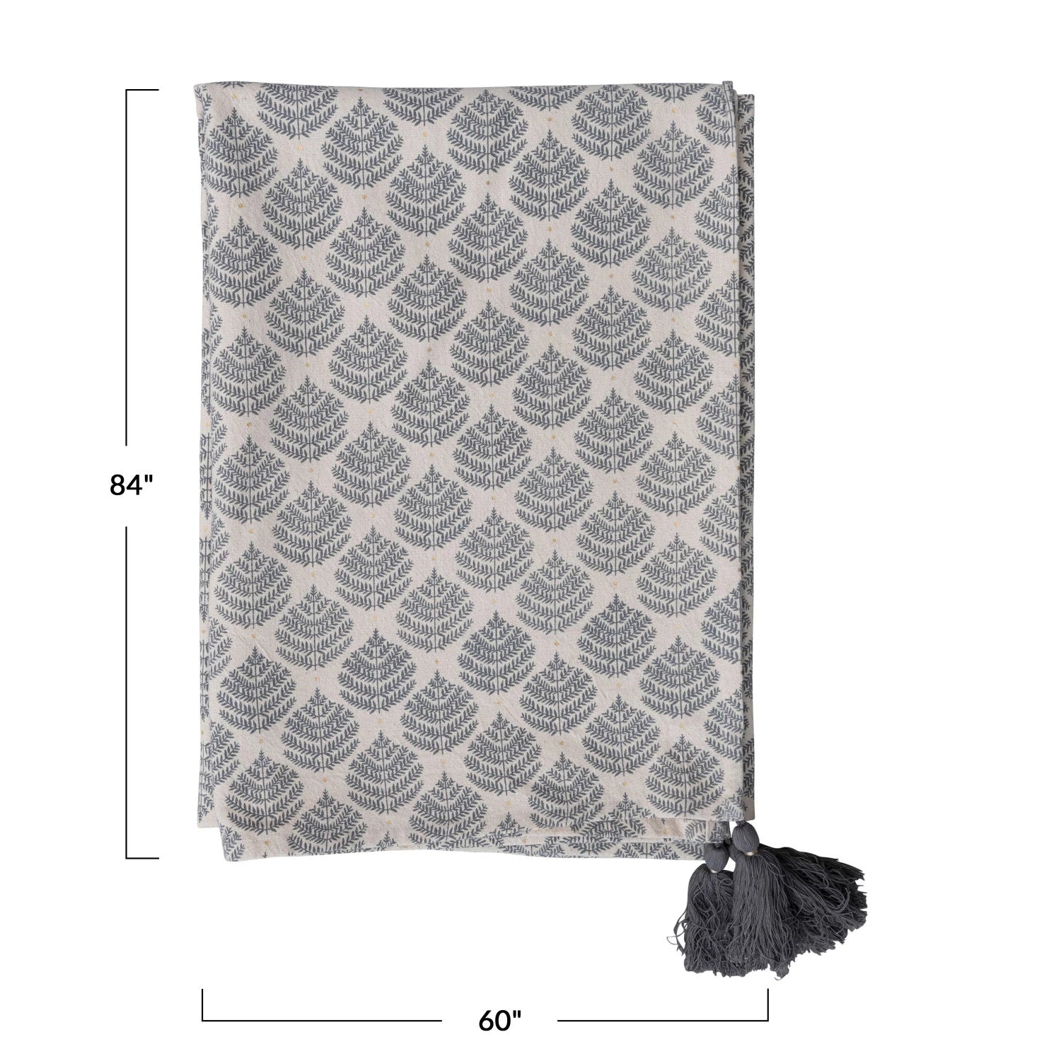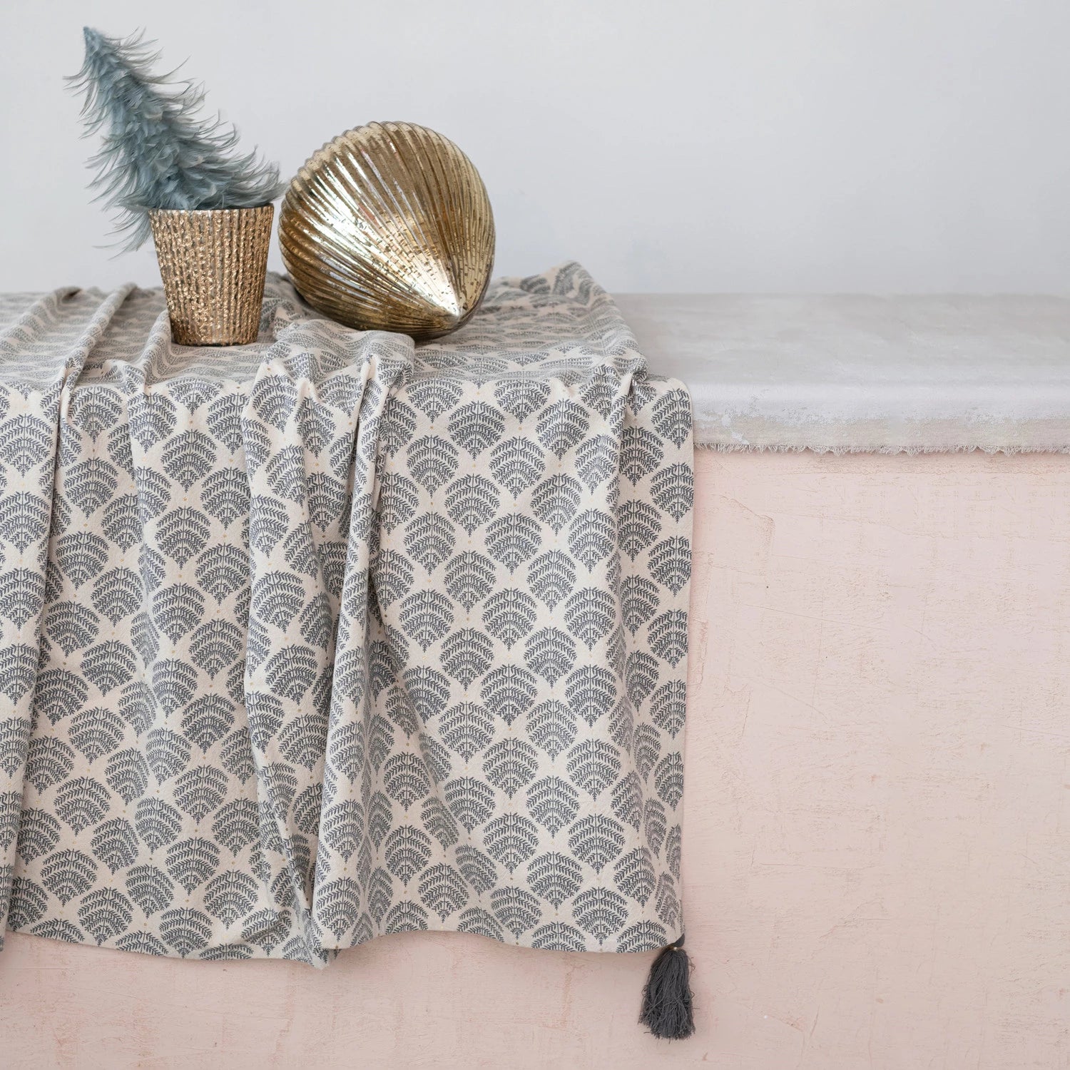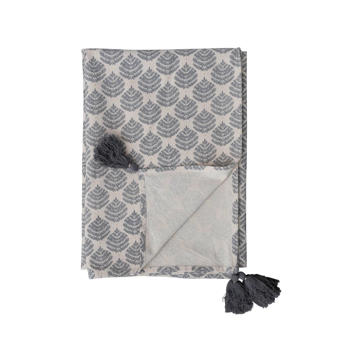 Add some pattern to any table setting with this cotton printed tablecloth, featuring a lovely leaf pattern, metallic gold detail, and playful tassels, all in a natural, gray-blue, and gold color scheme. We love this! Neutral enough to go with all styles in your home.