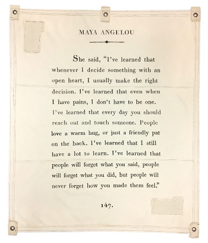 Quotes are silk screen printed by hand and machine stitched borders and frayed edges.