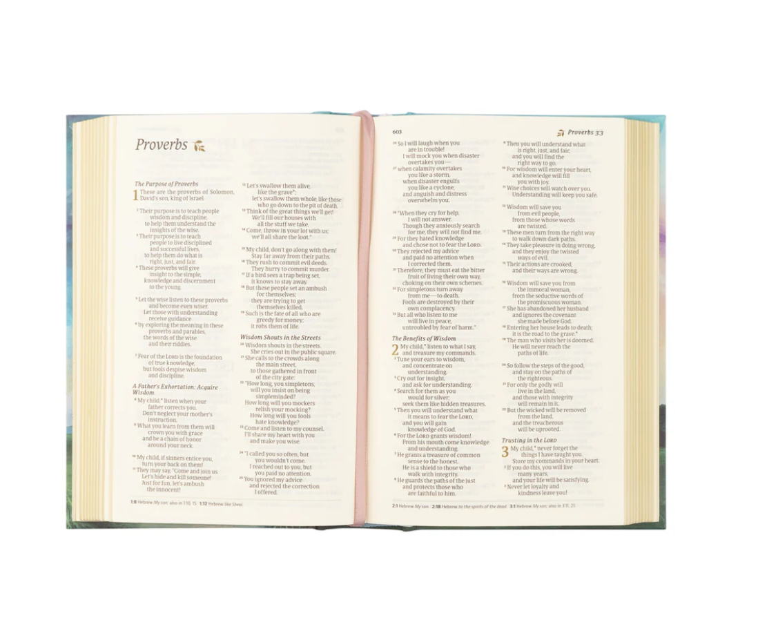 This beautiful NLT Compact Bible features hand-painted artwork inspired by the rolling prairies of the western United States. Its front cover displays “The Holy Bible,” in gold-foiling letters while the back features the phrase “The well that won’t run dry,” referencing Isaiah 58:11. The peaceful imagery of a flowing stream reminds us that even when everything around us feels dry, we have a constant source of life through God’s Word. May the words within these pages nourish you spiritually, filling your heart with the truth and life of the Gospel.