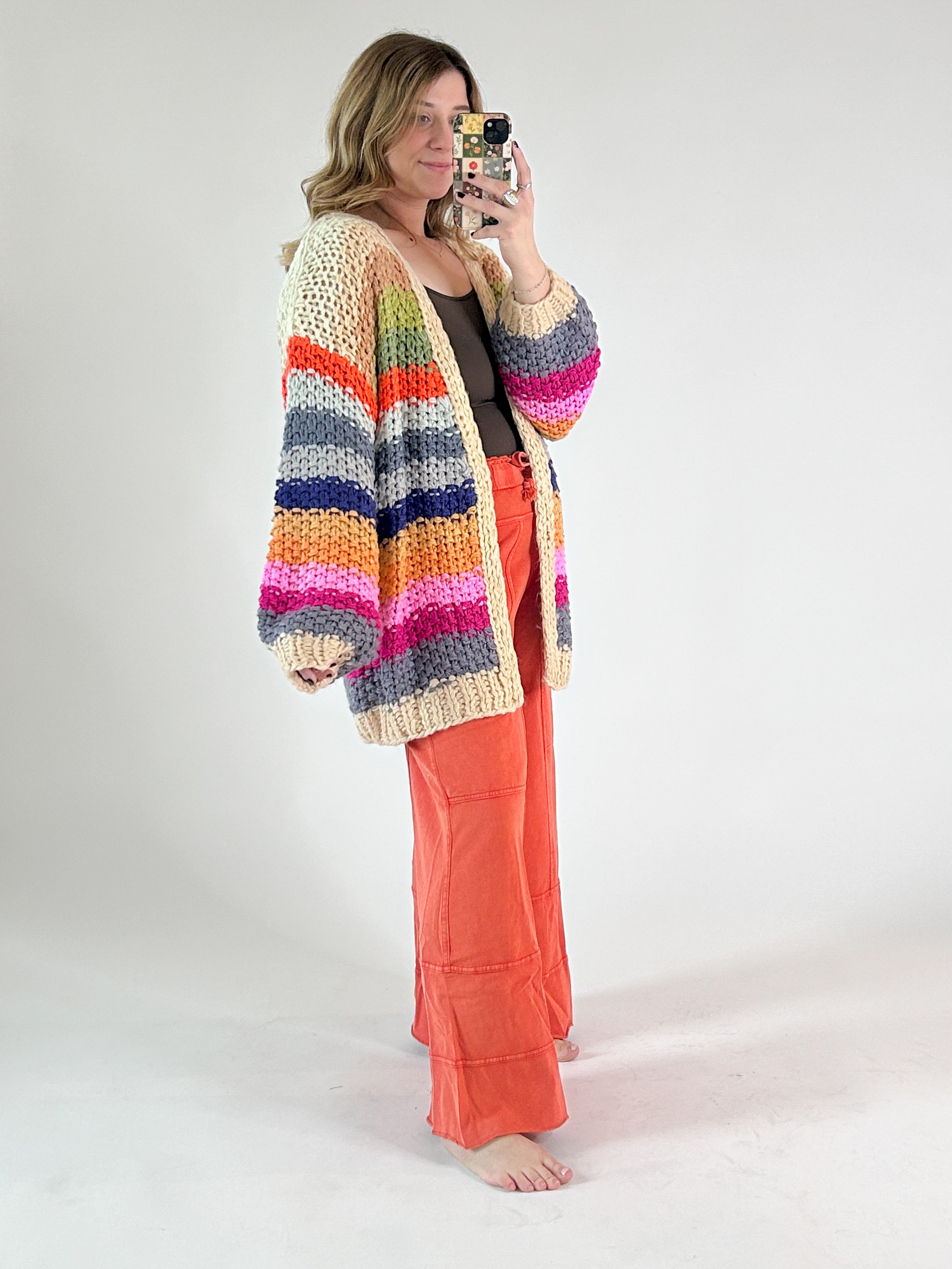 Hand-crocheted with thick, rainbow-hued yarn, this open cardigan feels like a wearable hug. Yes, it has pockets! The relaxed drape and oversized sleeves give it that effortlessly cozy look, while the chunky texture adds just the right amount of warmth. Ribbed edges keep the shape feeling intentional, and side pockets make it as practical as it is charming. Throw it on over a simple tee and your favorite denim for an easy, feel-good everyday outfit. Layer it with a flowy dress or midi skirt and boots to let the colors pop while keeping things cozy.