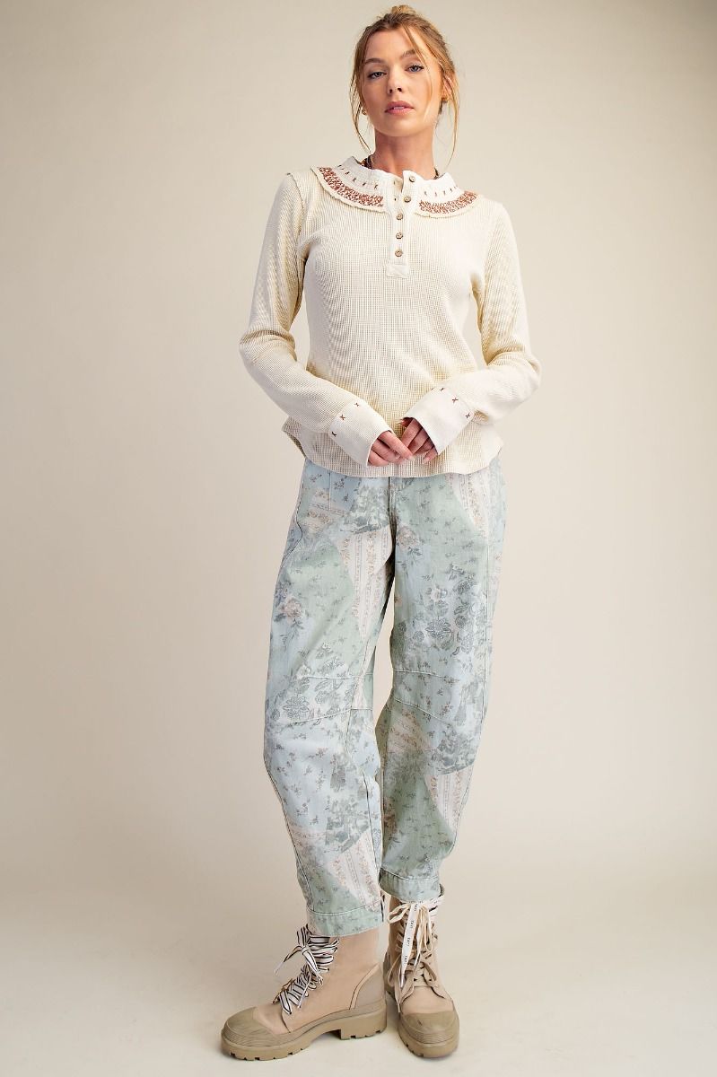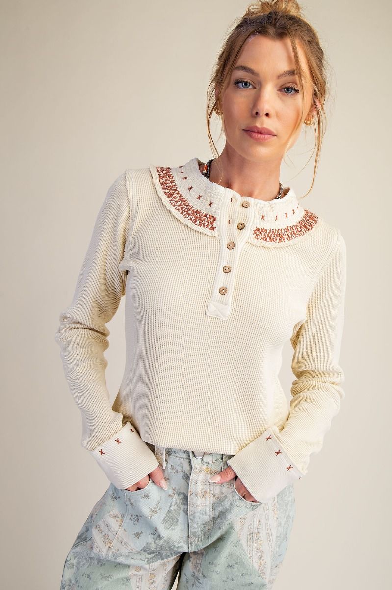 This washed thermal Henley is the kind of top you’ll want to live in. The soft waffle knit and mineral wash give it that perfectly broken-in feel, while the embroidered neckline adds a sweet little touch. Lightly fitted with a button-up front, it’s easy to toss on with jeans or layer under a flannel when it’s chilly.