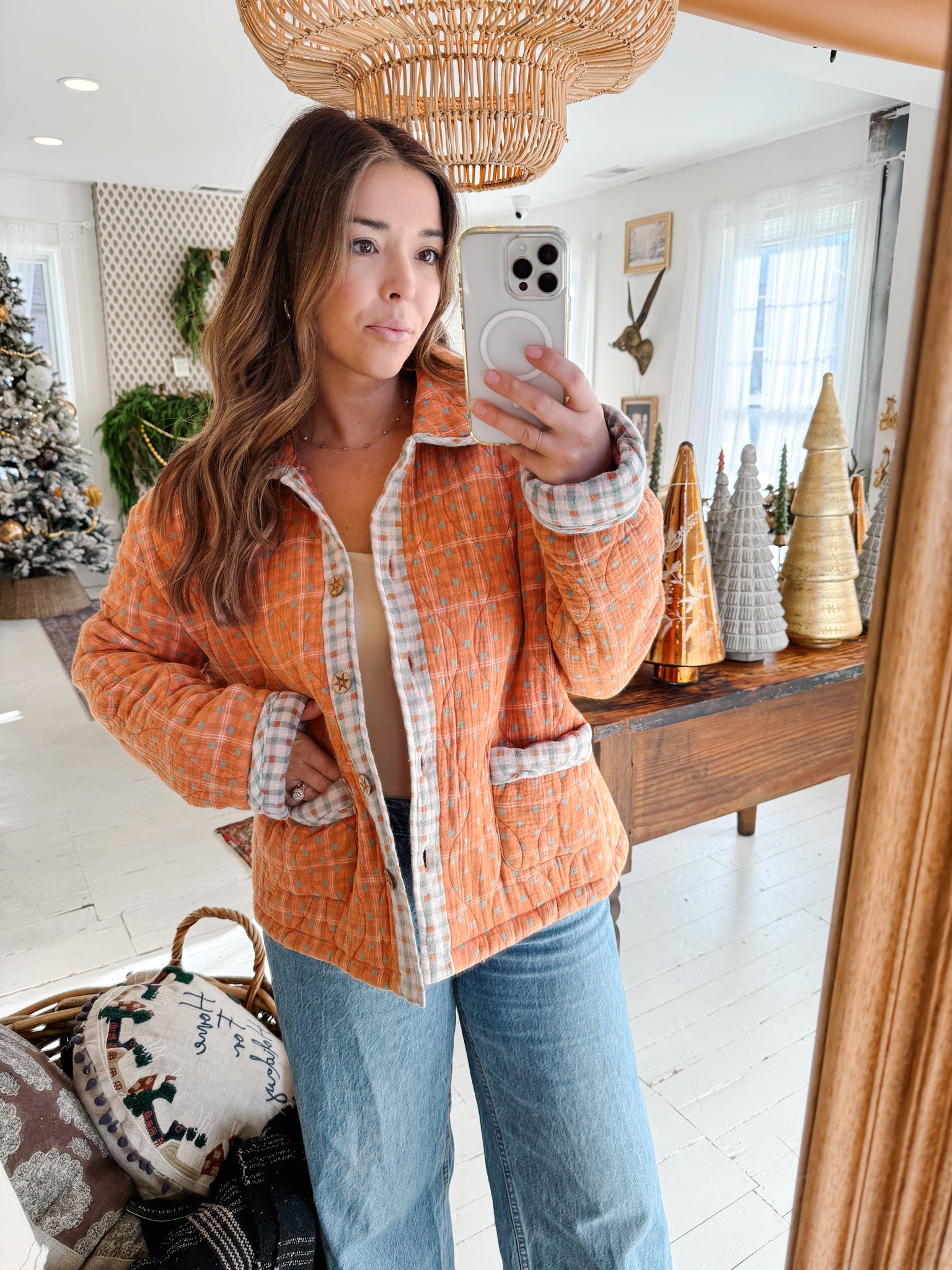 The Clementine Jacket brings warmth and cheer to your everyday style. Its soft quilted texture and cheerful plaid pattern make layering effortless, while the relaxed fit pairs perfectly with sweaters, dresses, or casual basics. The vibrant orange hue adds a pop of color to gray days, and the vintage-inspired design feels both timeless and modern. Reach for it again and again - it's the jacket that becomes a closet staple.